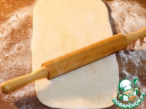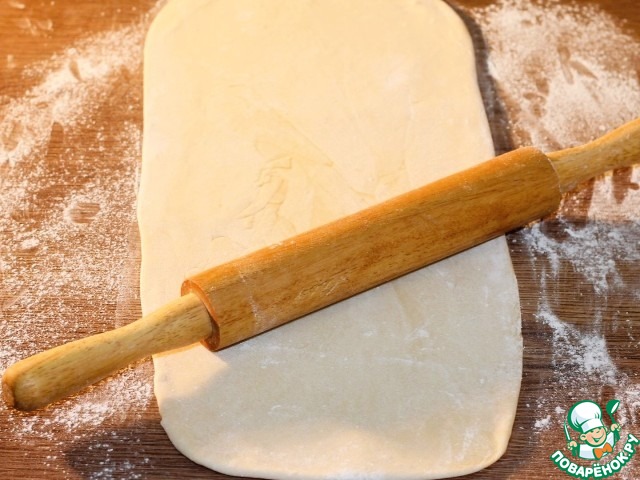 11. Присыпать стол мукой и раскатать тесто в пласт (у меня 23*30 см) толщиной 5 мм. Если тесто начнет прилипать к поверхности, припылите мукой.