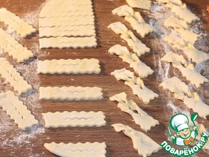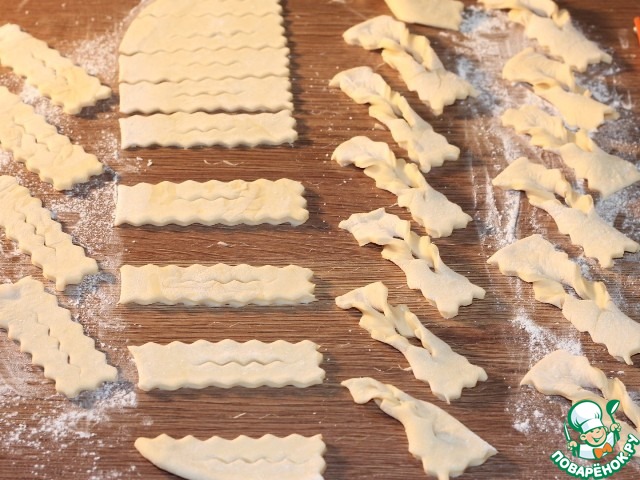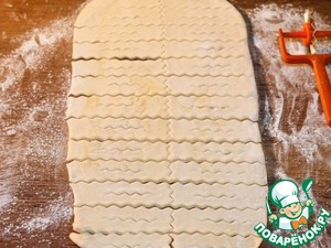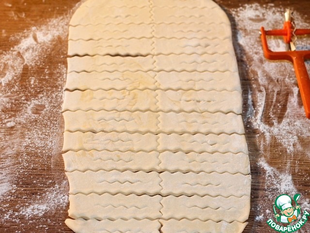 12. Нарежьте тесто на прямоугольники или ромбики. Я использовала фигурный нож в виде колесика. Посередине сделайте надрез, не доходя до краев.