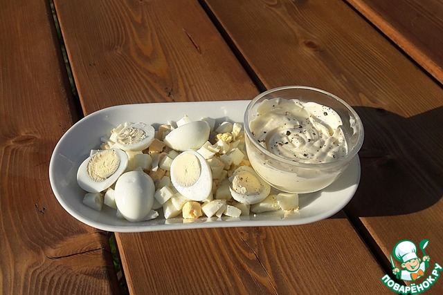 Яйца почистить. Куриное яйцо порезать кубиком. Перепелиные яйца порезать пополам. Приготовить заправку для салата: смешать соль, перец и майонез.