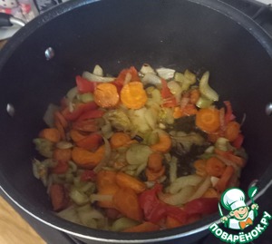 В глубоком казане разогрейте масло и смешайте лук, морковь, сельдерей, чеснок, перец болгарский и соль. На огне ниже среднего тушите овощи 30 минут, иногда помешивая. Это будет софрито.