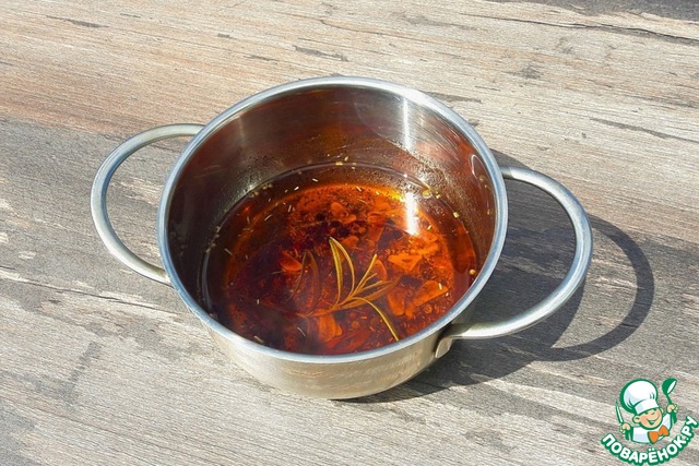 Прогреть масло с травами и специями 3 минуты на слабом огне. Масло не должно кипеть!!! -