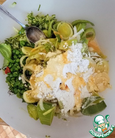 Разморозить и раздавить зеленый горошек с помощью кухонного пресса. В одну ёмкость сложить цуккини, лук, зелёный горошек, лук-порей, соль, муку, черный перец, куркуму, петрушку, мяту, укроп и яйца. Перемешать.