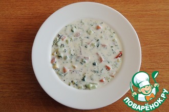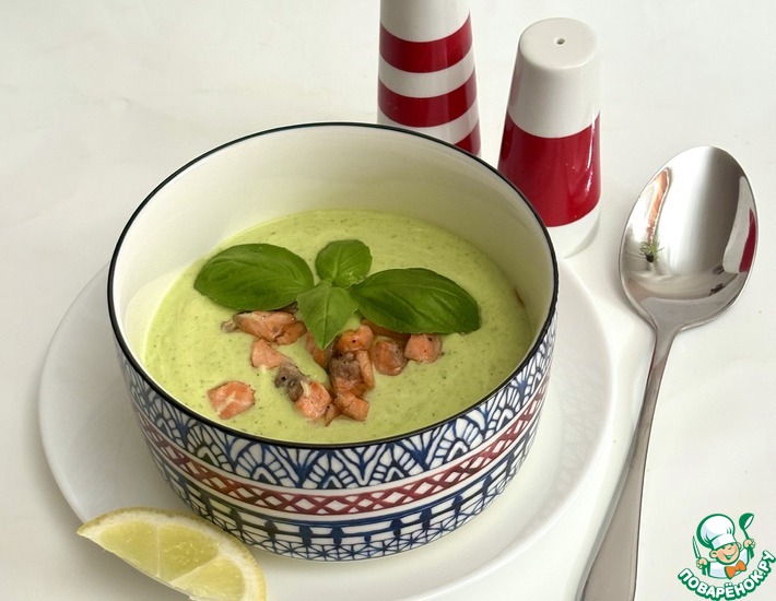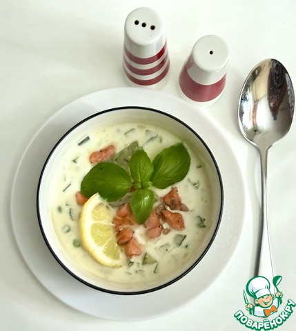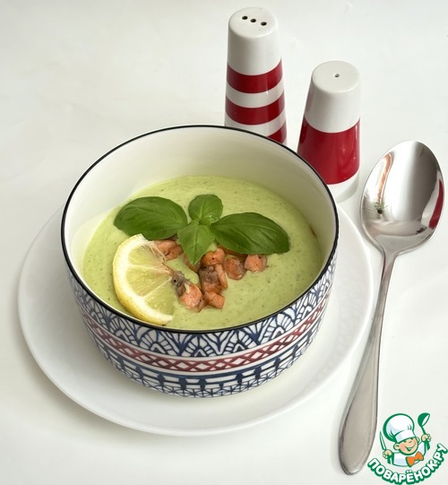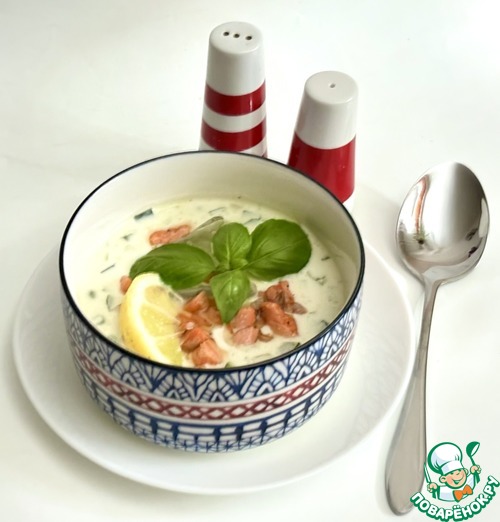 Разлить суп по тарелкам, украсить рыбкой и базиликом. По желанию выдавить из одной дольки лимонный сок. Можно добавить пару кусочков льда.