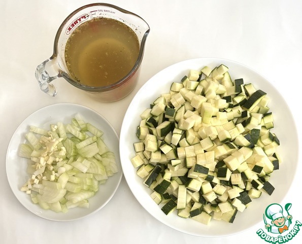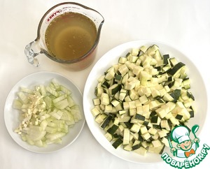 Залить бульон кипятком. Нарезать мелкими кубиками цуккини, также нарезать кубиками лук и чеснок.