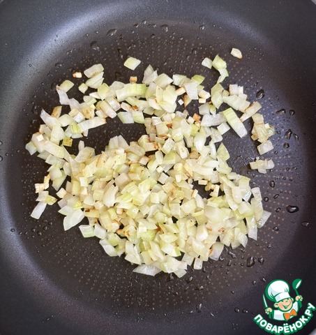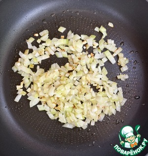 Обжарить лук и чеснок до лёгкого зарумянивания.