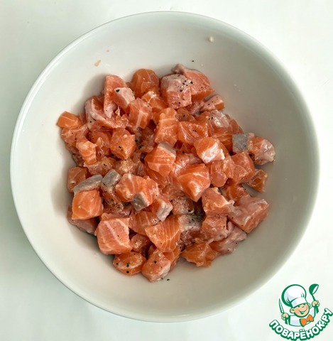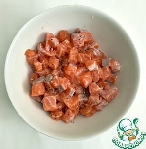 Подавать можно с сухариками, с креветками или с красной рыбой. Мы любим такие супы с рыбой. Форель нарезать мелкими кубиками, посолить и поперчить, сбрызнуть лимонным соком, дать помариноваться минут пять.