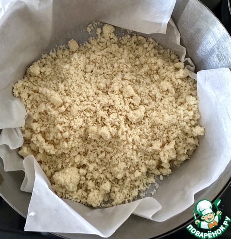 Форму лучше выстелить бумагой. Высыпал в неё примерно половину крошки. Слегка примял. Это будет основа пирога.
