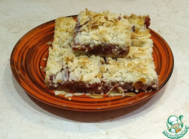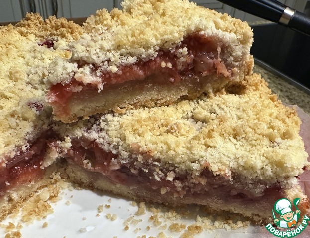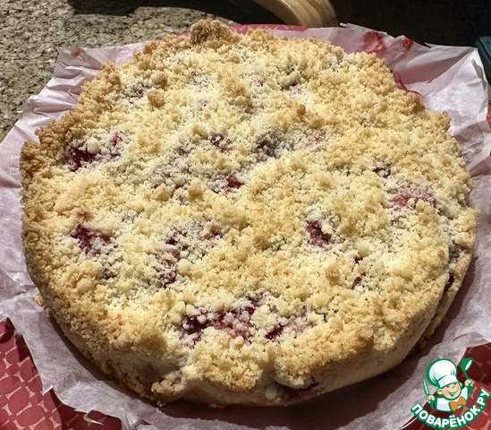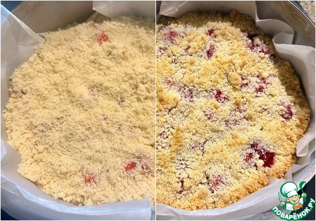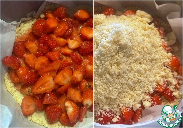 На основу выложил подготовленную клубнику, и сверху присыпал оставшейся крошкой. Которое – тесто.