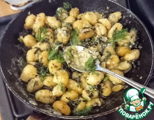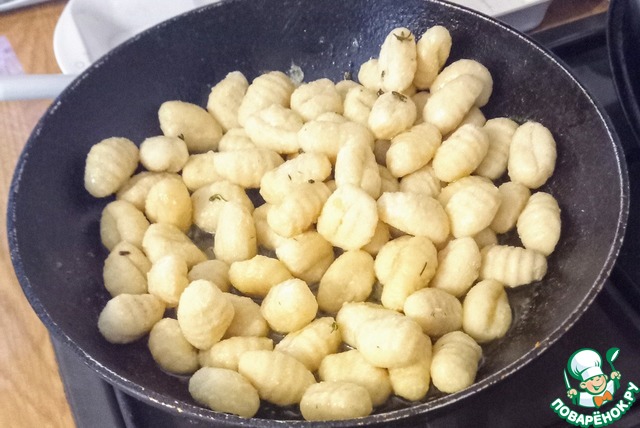 • В ту же сковороду добавить оставшееся оливковое масло, сливочное масло и ньокки. Готовить до 5-8 минут до золотистости.