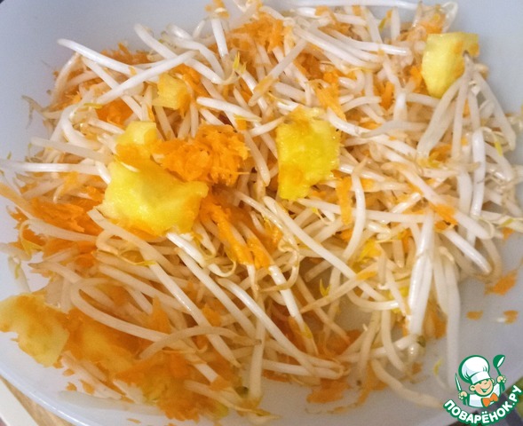 Смешайте соевые проростки с манго, морковью и арахисом.