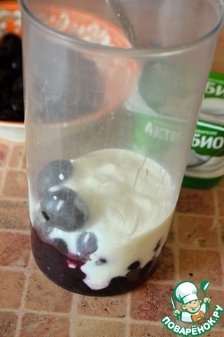 В посуду для измельчения поместить виноград, чернику, йогурт (я взяла "Актибио" в стаканчике).