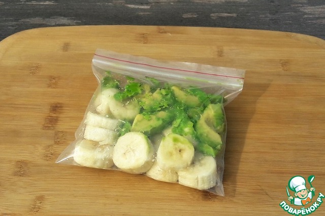 Авокадо очистите от кожуры, удалите косточку, порежьте. Бананы очистите и нарежьте крупными кусочками. Сложите в пакет. Плотно завяжите пакет и уберите в морозильник на 2 часа.