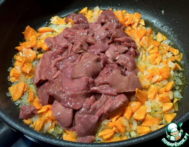 Перемешивая, НЕ обжаривал печёнку, а продолжал в том же режиме, томить ее в луково-морковном облаке.