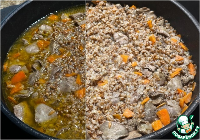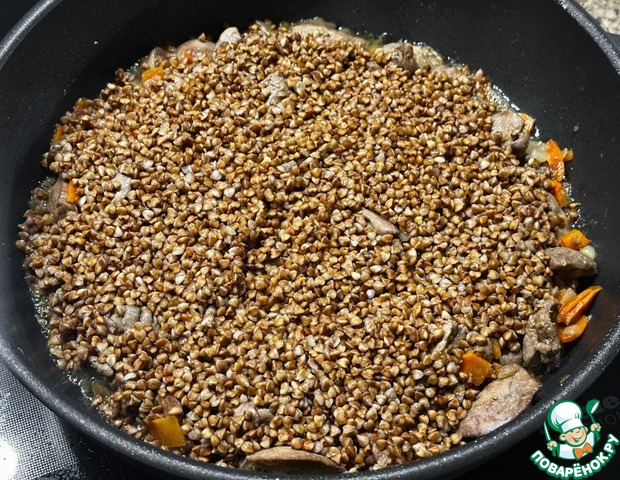 И поверх печенки томлёной гречку выложил. Ровным слоем,