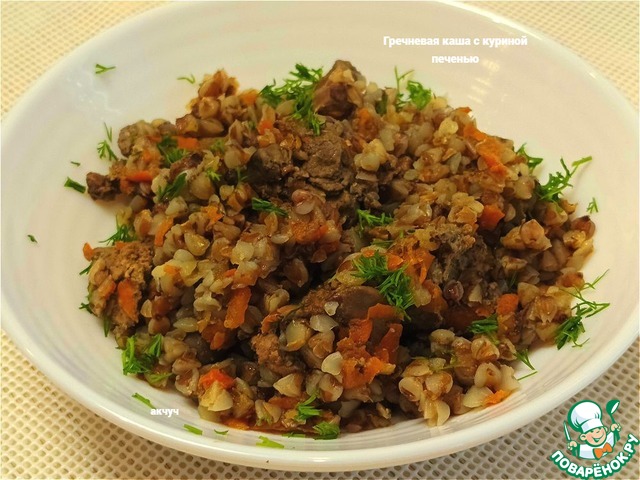 Оно, конечно, можно сказать, вернее назвать такую кашу как-нибудь типа «Гречневая купеческая первогильдийская, которую даже графья с князьями ели так, что …» Можно. Только зачем? Так что я приготовил кашу гречневую с печенкой куриной. Как там незабвенный ВС говаривал? Он правда про супчик, но … «… да с потрошками!» В общем, получилась вот такая, непритязательная, т. е. без претензий на «высокую кухню», гречневая каша с …