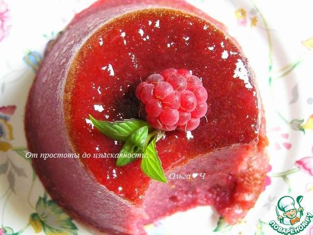 Сверху смажьте вишневым конфитюром, украсьте малиной и мятой.