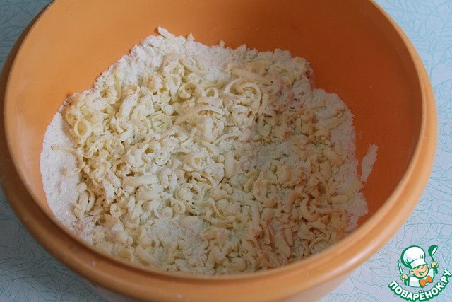 Достать масло из морозилки и натереть на терке. Удобно натирать, обмакивая масло в муку.