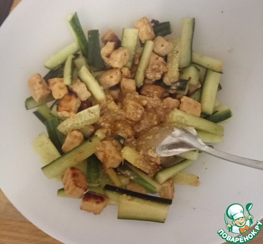 В салатницу положить курицу, огурец, имбирь. Залить 2/3 заправки. Перемешать.