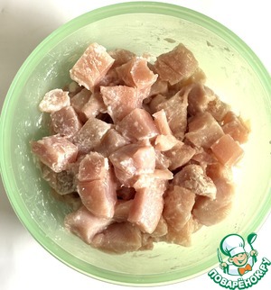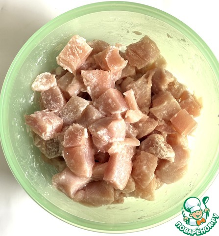 Куриное мясо нарезать кубиками, посолить и добавить крахмал, хорошо перемешать.