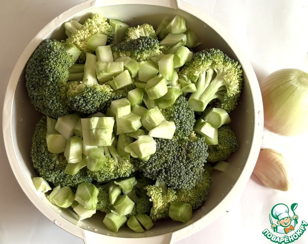 Брокколи разобрать на соцветия, кочерыжку мелко нарезать (зачем её выкидывать), помыть под проточной водой и сварить в течении 2-3 минут. Слить воду с брокколи и обдать холодной водой.