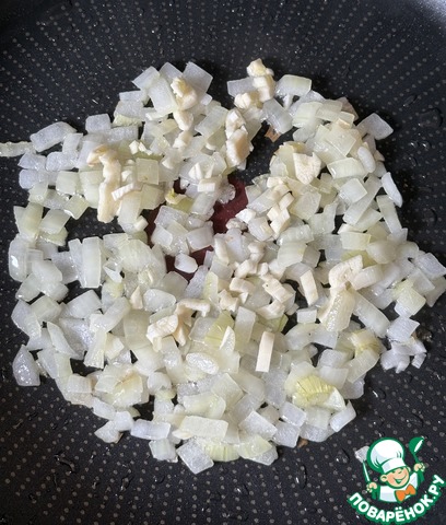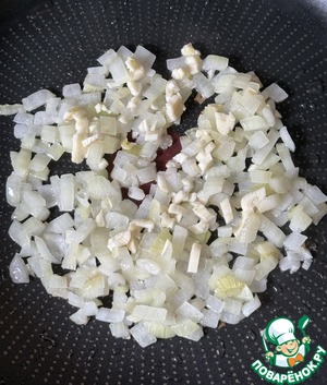 На большой сковородке обжарить на одной столовой ложке масла лук до прозрачности, добавить чеснок и жарить 1-2 минуты.