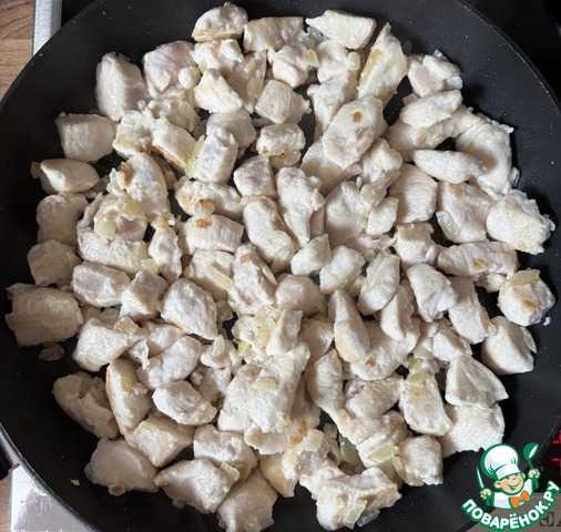 Добавить куриное мясо и обжарить до зарумянивания, убавить огонь и тушить до готовности (минут 10-20).