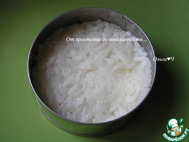 Тем временем отварите рис до готовности, посолите, добавьте сливочное масло по вкусу, перемешайте. Для праздничной подачи выложите рис на тарелки с помощью кулинарного кольца, утрамбуйте.
