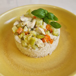 Это нежное блюдо из куриного филе с молодыми овощами и рисом может служить полноценным ужином не только в будни, но и в праздники, достаточно только выложить его с помощью кулинарного кольца. Попробуйте!