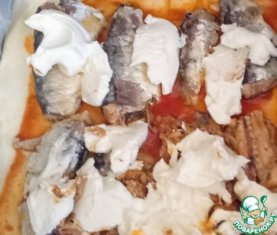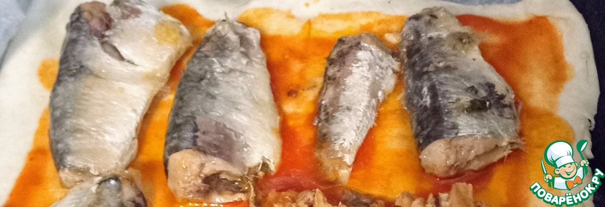 Разогреть духовку до 200С. Слегка раскатать тесто. Смазать его томатной пастой и выложить сардины