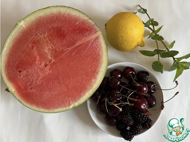 Удалить косточки из вишни, нарезать арбуз кусочками. Сложить в блендер вишню, ежевику и мяту. Выдавить сок из половины лимона, пробить в пюре.