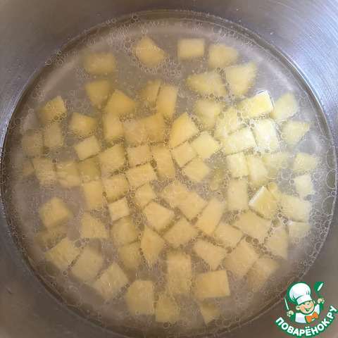Картофель нарезать мелкими кубиками и поставить варить в бульоне.
