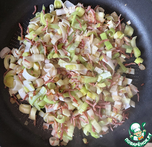 Порей нарезать полукольцами, добавить к луку с беконом и жарить около пяти минут.