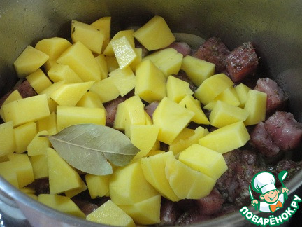 Добавить мясо, сельдерей, картофель, лавровый лист и залить горячей водой. Перемешать, накрыть крышкой и варить на медленном огне около часа. Какой аромат витал на кухне!