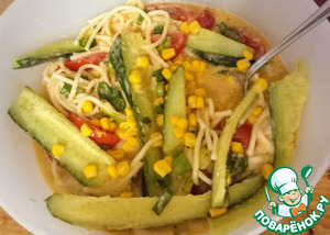 Тем временем отварить лапшу в соответствии с инструкциями. Наконец, в салатнице смешать маринованный зелёный лук, помидоры, огурцы, 1/3 банки кукурузы и отваренную лапшу. Полить соусом. Можно подавать. Приятного аппетита.