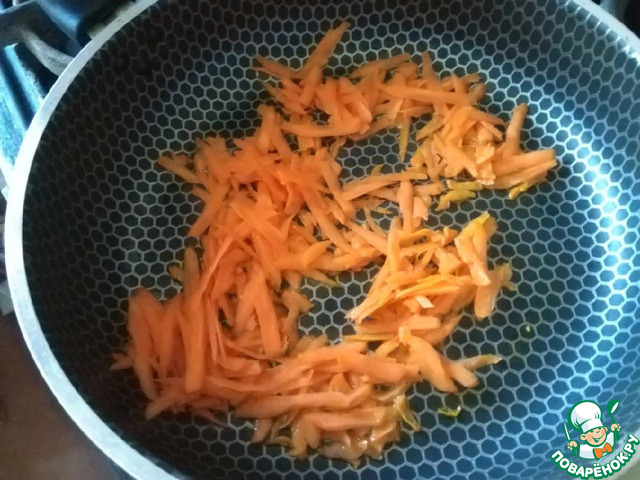 Морковь натереть на крупной тёрке. Обжарить на ложке масла.