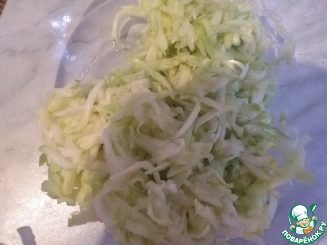 Кабачки натереть на крупной тёрке, посолить, дать постоять, пока не дадут сок. Затем жидкость отжать.