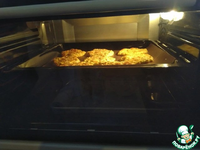 Сыр натереть на мелкой тёрке и вмешать в массу. Выкладывать ложкой лепёшки на смазанный растительным маслом лист. Смазать необходимо, даже если у вас антипригарный коврик.