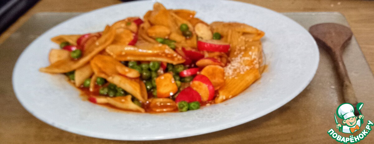 Затем, охладить лапшу под холодной водой. Полить растительном маслом до полного покрытия. Выложить в салатницу. Добавить редис и зелёный горошек. -