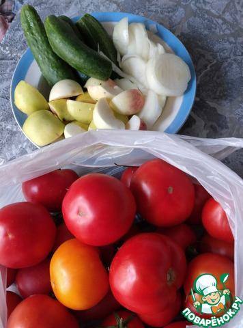 Лук репчатый порежем кольцами, если мелкий - можно не резать. Яблоки резать дольками (у меня кисло-сладкие опадыши). Помидоры, я положила еще 3 огурца.
