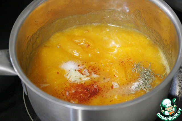 Затем снять с огня и аккуратно измельчить соус при помощи погружного блендера до однородной консистенции.