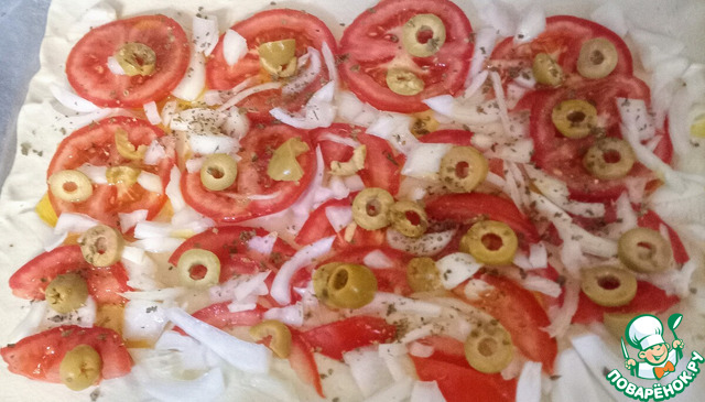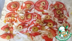 • Разогреть духовку до 210С. Нарезать помидоры тонкими слайсами 5мм толщиной каждый. Раскатать тесто и выложить помидоры, отступив 2см от каждого края. Рядом с помидорами выложить лук. Равномерно посыпать раскрошенными оливками, половиной ложки орегано и спрыснуть двумя столовыми ложками оливкового масла