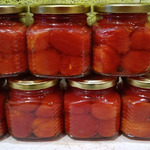 И я не стерилизовала в духовке. Чистила над тазом, чтобы сок туда стекал, потом добавила туда очищенные помидоры и после закипания, на среднем огне, варила 20-25 минут. Добавила на 5кг, 2столовые ложки соли.