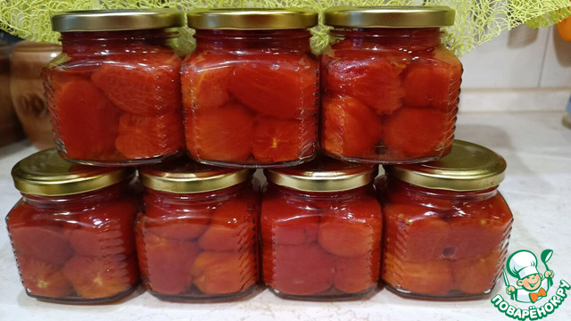 Ингредиенты даны на 4 банки объемом 0,5 л. Если помидоры крупноваты, то уйдёт ~ 2,2 кг, если мельче, то и все 2,5 кг.