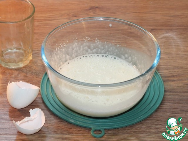 3. Вбиваем в миску 1 яйцо. Всыпаем 1 щепотку соли (по желанию) и вливаем растительное масло (100 мл). Перемешиваем и взбиваем венчиком (1 мин.) до получения пышной массы.