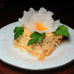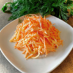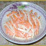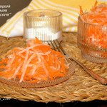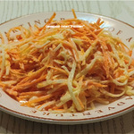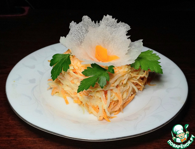 Простейший салат, в который овощи кладут в равных пропорциях. Это важно! Сладость моркови не должна заглушать остроту дайкона и наоборот. Дайкон можно заменить маргеланской редькой, в идеале - арбузной. Тогда салат будет не только сочен и вкусен, но ещё и красив. Для эстетичной подачи натереть овощи на тёрке для корейской моркови, для большей воздушности - на обычной крупной тёрке. Прошу к столу!