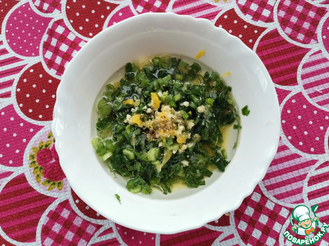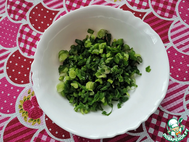 Зелёный лук промыть проточной водой, обсушить бумажным полотенцем и нарезать колечками.