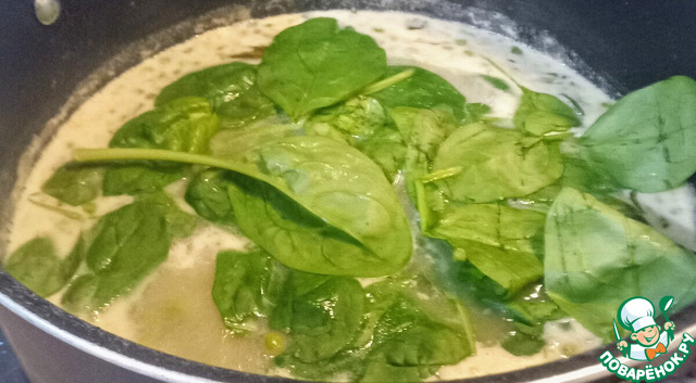 Добавить базилик и шпинат. Довести до кипения, затем уменьшить огонь и томить минут 5. -
