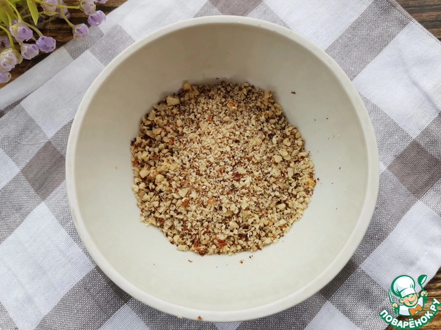 Одну часть грецких орехов измельчить в мелкую крошку, другую часть порубить на небольшие кусочки. -