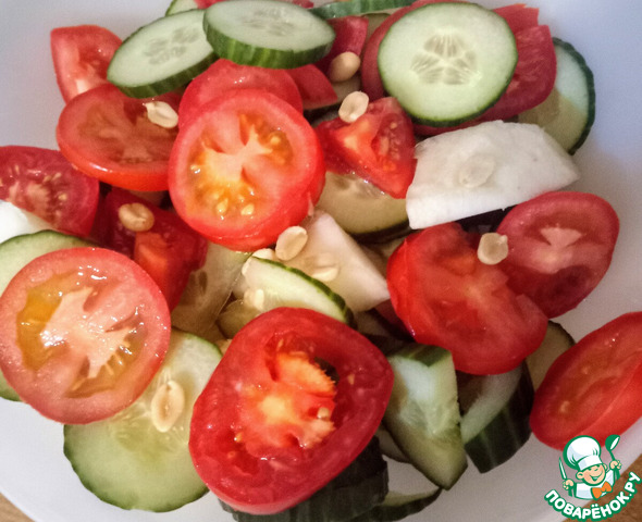 Добавить нарезанные огурцы и помидоры. Полить соком лайма и посыпать арахисом..