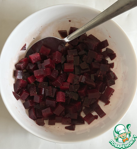 Свеклу нарезать мелкими кубиками, немного посолить и поперчить, добавить уксус и перемешать, оставить мариноваться пару минут. Уксус у меня 3%, я взяла 2 столовые ложки, можно взять яблочный или фруктовый, подогнав его количество под свой вкус.